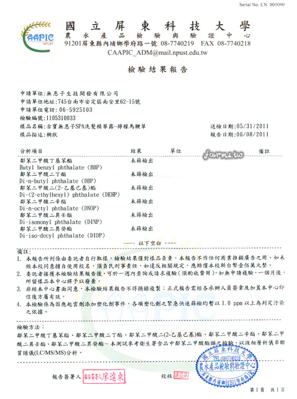 古寶檬檬馬鞭草洗髮精不含六種塑化劑檢驗報告: