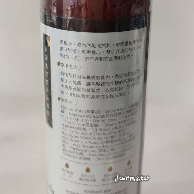 使用方法/ 潔髮後,略微吹乾或拭乾,取適量超彈柔順膽汁髮精萃於手當心,雙手互搓均勻抹於秀髮(免沖洗)