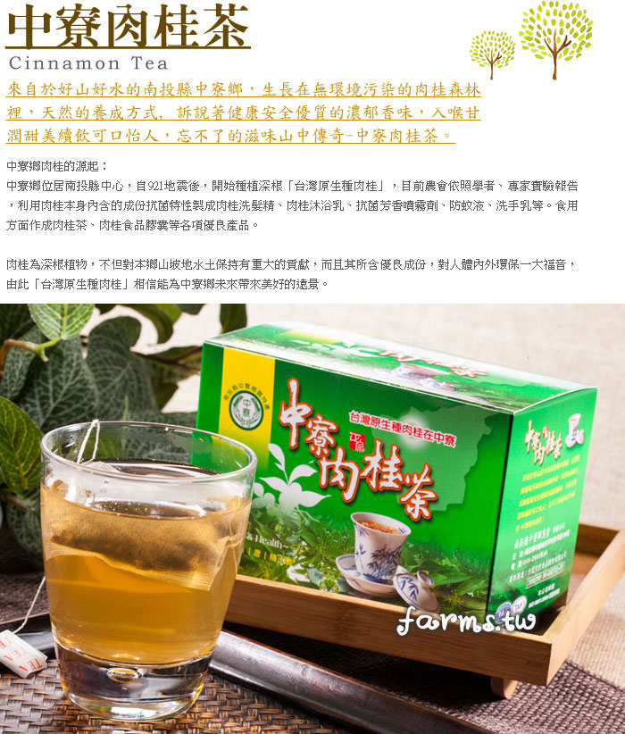 中寮肉桂茶 保存期限:2年 中寮鄉肉桂的源起: 中寮鄉位居南投縣中心,自921地震後,開始種植深根「台灣原生種肉桂」,肉桂製成肉桂洗髮精、肉桂沐浴乳、芳香噴霧劑、防護液、洗手乳等。食用方面作成肉桂茶、肉桂食品膠囊等各項優良產品。 肉桂為深根植物,不但對本鄉山坡地水土保持有重大的貢獻,由此「台灣原生種肉桂」相信能為中寮鄉未來帶來美好的遠景。