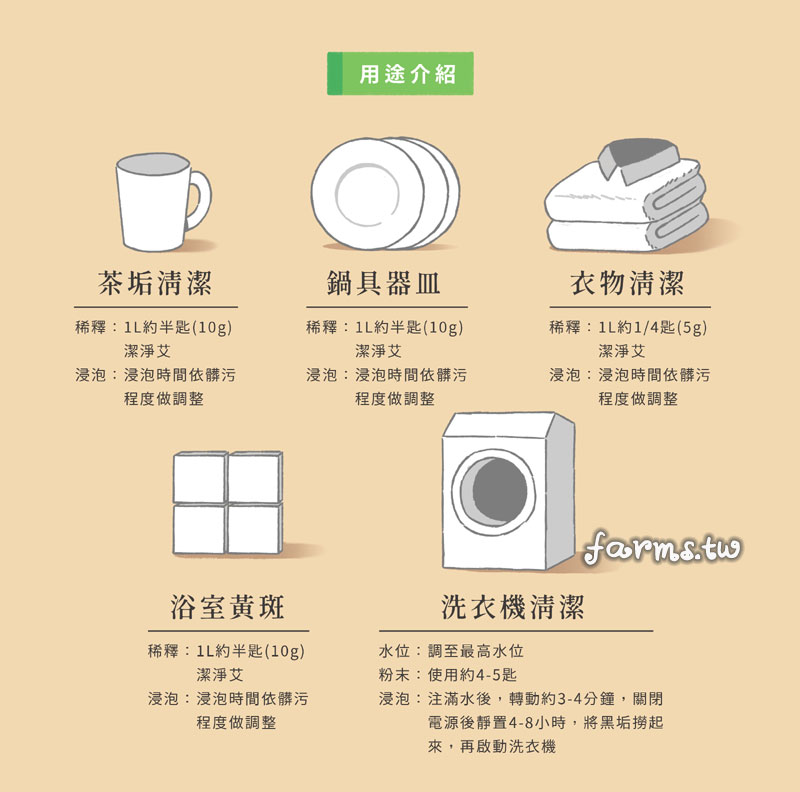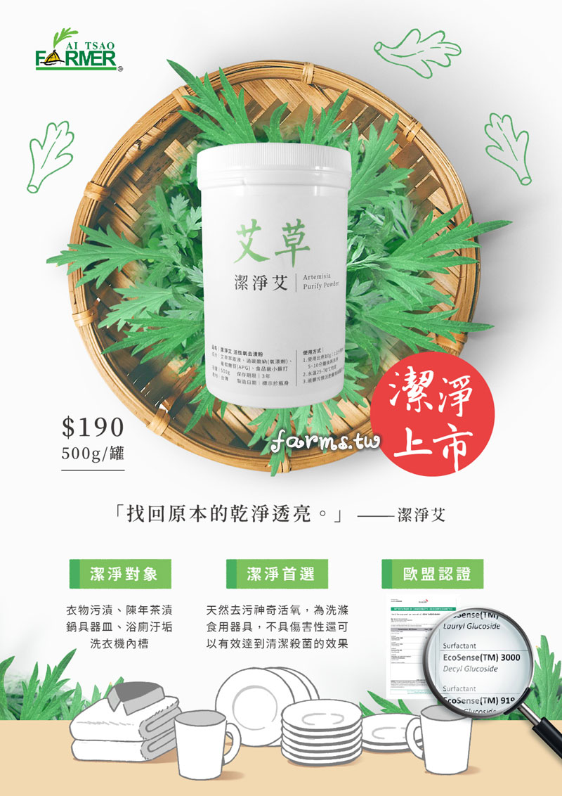 主要成分:艾草萃取液、過碳酸納(氧漂劑)、葡萄糖苷(APG)、食品級小蘇打