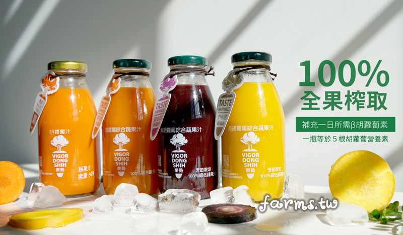 100%胡蘿蔔綜合蔬果汁:全果胡蘿蔔原汁、白葡萄濃縮汁、柳橙濃縮汁、鳳梨濃縮汁、檸檬濃縮汁、水。 (80%全果胡蘿蔔原汁+20%濃縮還原果汁)
