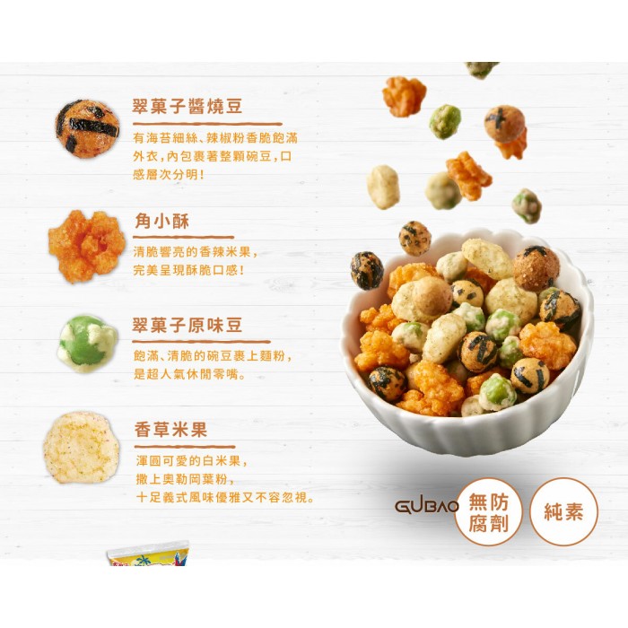 【成份】角小酥、翠菓子原味豆、翠菓子醬燒豆、香草米餅