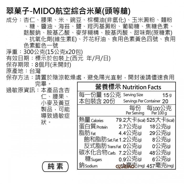【過敏原資訊】本產品含杏仁、黃豆、腰果及小麥製品,可能導致過敏症狀