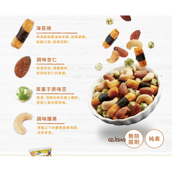 【成分】調味杏仁、調味腰果、海苔捲、翠菓子原味豆